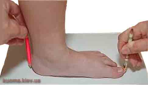Для правильного измерения длины стопы ребенка необходимо поставить босую ножку ребенка на лист бумаги, попросить его наступить и отметить крайние точки, (или обвести контур) учитывая заднюю косточку. Как показано на рисунке.
